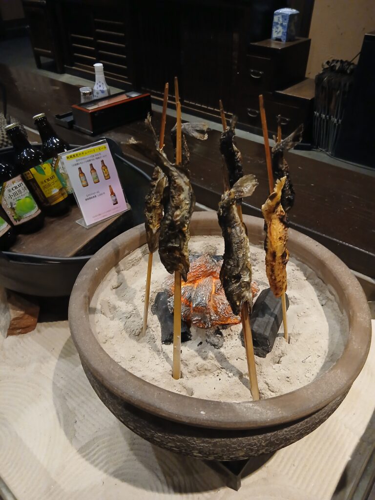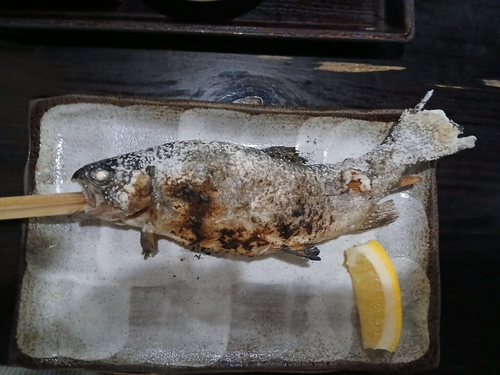 炭火でじっくり焼かれたやまめを、串のままいただく特別感。